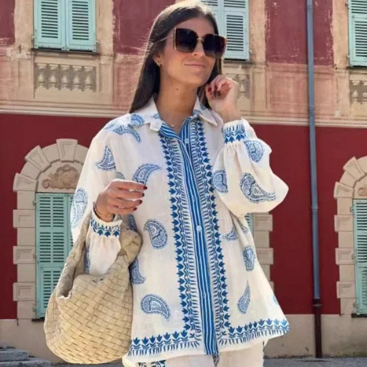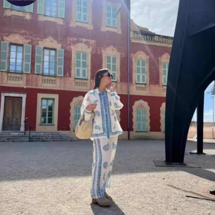 Elevate your summer wardrobe with this fashionable 2-piece set, featuring a printed long-sleeve top and high-waist wide-leg pants. Perfect for casual outings or office wear, this outfit combines comfort and style effortlessly.