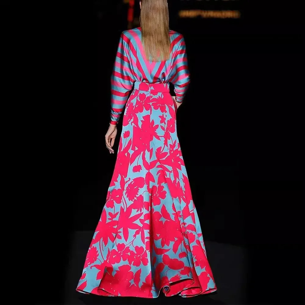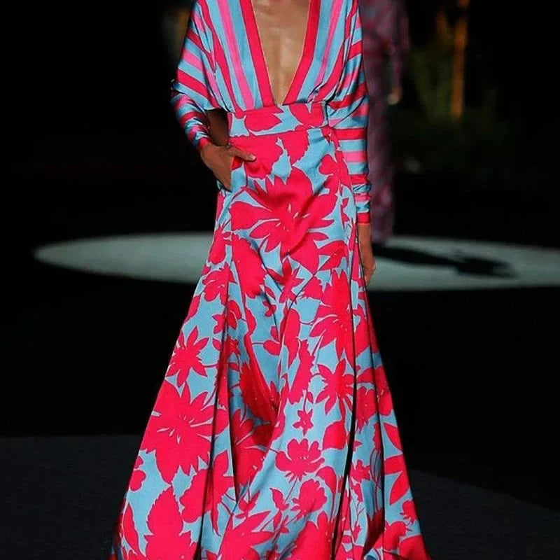 The V-neckline and long sleeves offer a refined, figure-flattering shape, while the lightweight fabric ensures comfort throughout the warm summer months. Designed for the modern woman, this dress reflects both fashion-forward thinking and an air of timeless grace.