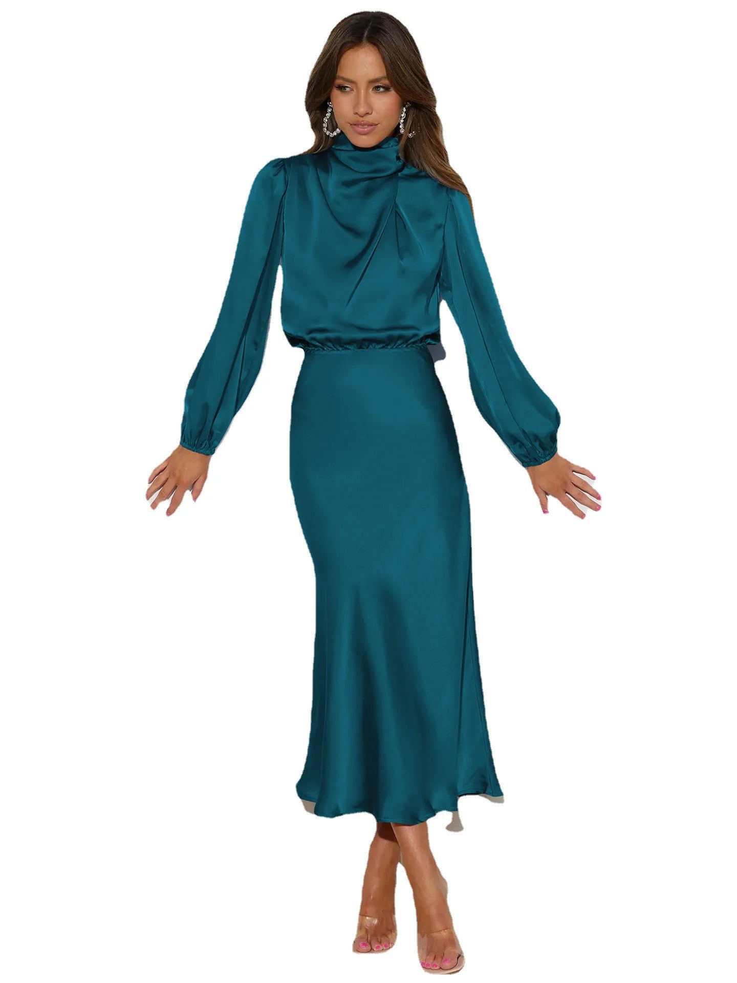 Elegant Satin Long Sleeve Loose Fitting Dress - Vintage Women's Evening Wear