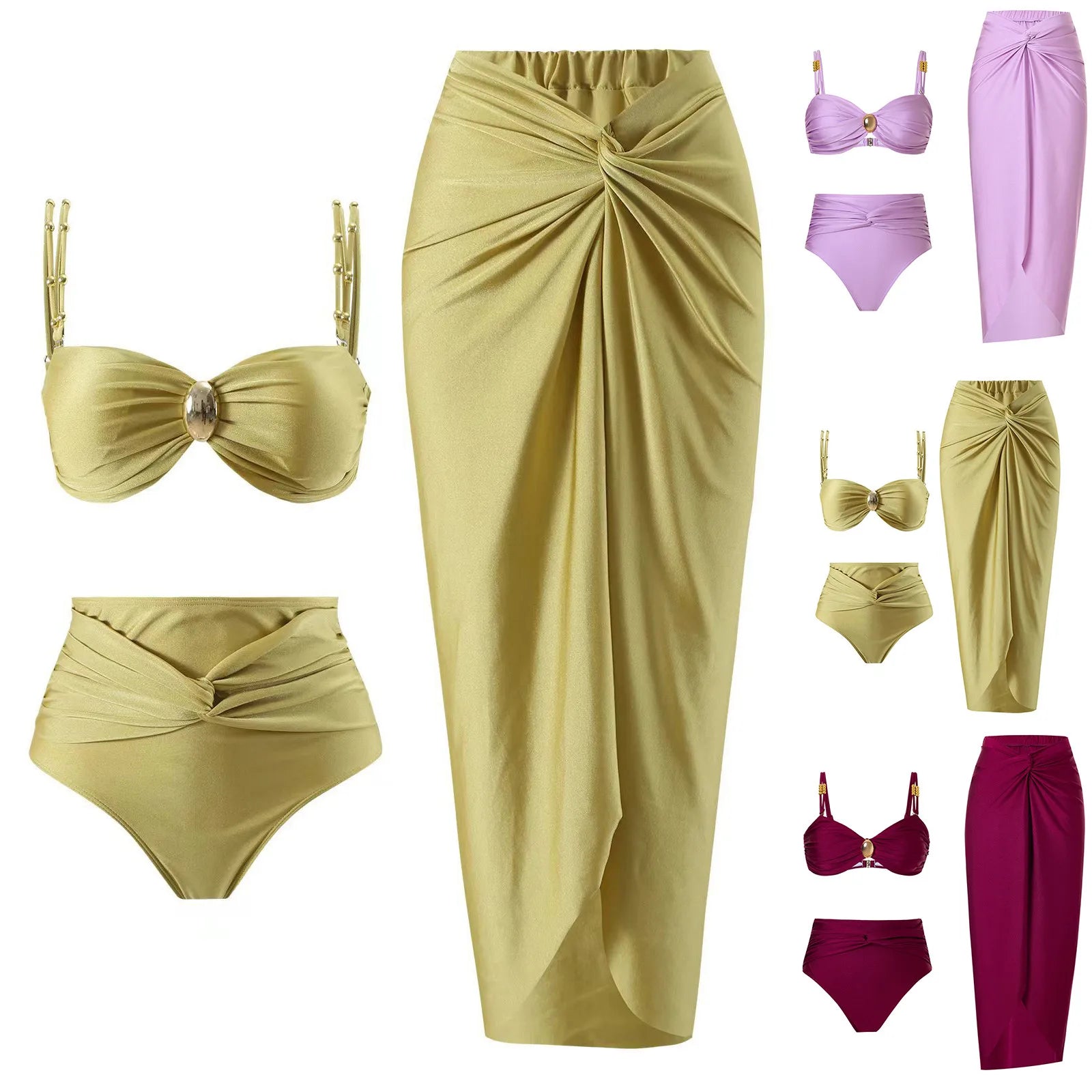 Elevate your beachwear collection with this Women's Fashion Split 3 Piece Solid Colour High Waist Sexy Bikini Swimsuit. Designed for confidence and comfort, this bikini set features a high-waist bottom, a stylish swim skirt, and a supportive top to flatter your curves. Perfect for beach vacations, pool parties, or summer getaways, this swimsuit combines fashion and functionality.